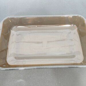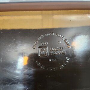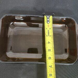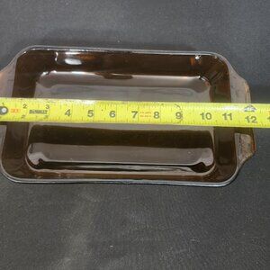 Vintage Brown glass Anchor hocking casserole dish. Dish measures roughly 12 inches across by 6.5 inches. There are various minor scratches throughout the dish from previous use, but is overall in wonderful condition for its age and previous usage.