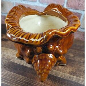 Vintage ceramic brown glazed extra-large seashell planter pot with a drain hole.