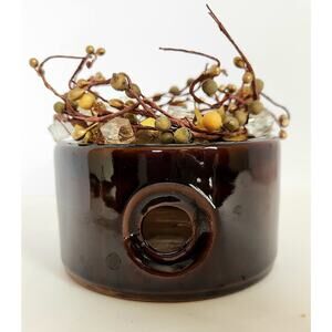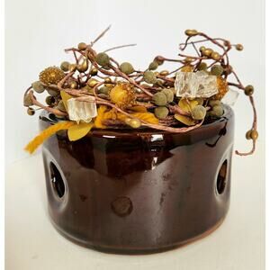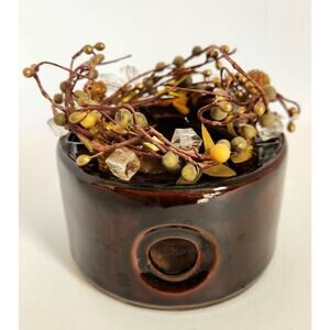 Charming vintage brown glazed pottery candle holder with circular cutouts and a removable decorative wreath accent. Measures 4" H x 5" Diam with 2.5" depth. Great for votive or tealight candles. Features glossy glaze and rustic decorative style. Some wear consistent with age, see photos.