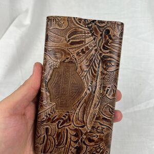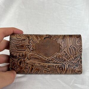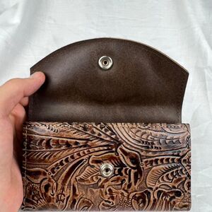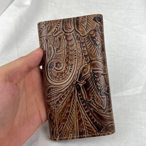 distressed leather, floral embossing, biker accessory, rustic wallet, antique finish, vintage detailing, WesternInspired, rugged look, motorcycle style, handcrafted