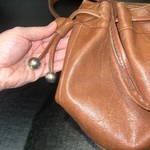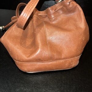 Stylish and versatile brown leather bucket bag. Perfect for everyday use with a spacious interior. Can carry as longer strap or double up for shoulder, silver ball hardware on drawstring, good vintage condition—please note wear visible but minimal like scratch marks on leather some wear on straps or exterior edges ..see all photos