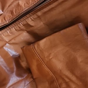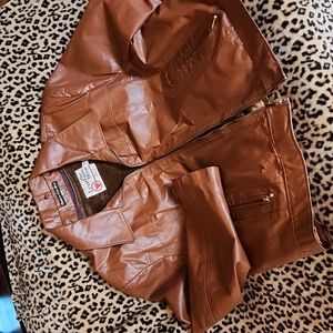 Super Cool Brown Carmel Colored Vintage Leather jacket by Sears. Late 70's!? Bull hide! Great Score!! New Vintage ! Hidden closet Gem!!! Not 1 flaw or sign of wear. Not even an arm wrinkle!! Love Love Love it! Too Big! Held on to for years myself after buying at an Estate Sale. Size 46 per tag. Inner fleece polyester vest zips out. Then jacket lined with polyester but silk like fabric. Awesome Find years ago! Downsizing! N want someone gets some use out of this awesome Retro Leather Jacket, Coat, Blazer. 2 slide in front hand pockets with brass color zip closure. No tarnish on zippers. This Dude is perfect! Pit to Pit 50", shoulder to shoulder 21", shoulder to cuff 27", Pit to cuff 13", shoulder to bottom 24 1/2". Light foam feeling minimal shoulder pads. All A+ condition! Any questions , feel free to message or comment!!