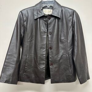 This brown leather jacket showcases a smooth finish and a timeless design with a standard folded collar. It features a zipper closure and full-length tapered sleeves, offering a fitted silhouette that enhances the wearer's shape.