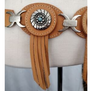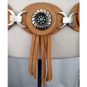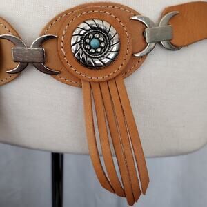 Vintage Brown Leather Silver-Tone Concho & Turquoise Stone Fringe Link Belt M/L