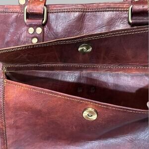 Note: This timeless leather tote bag boasts a rich burgundy tone and rugged patina for a well-worn, vintage aesthetic. The green interior lining adds a unique contrast. Ideal for everyday use or as a work bag. Please review all photos carefully, as lighting may affect color appearance.
