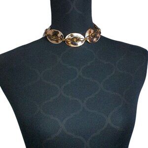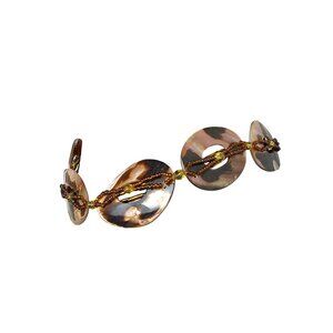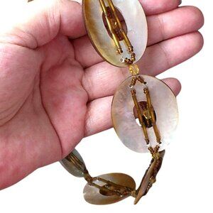This choker necklace combines natural brown lip tiger shell discs and intricate glass beadwork, evoking a timeless vintage charm. The adjustable chain ensures a comfortable fit, making it a versatile piece that blends elegance with a touch of old-world sophistication.