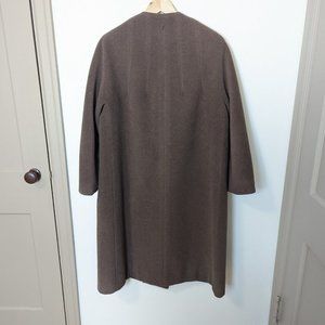 Classic brown pea coat. Features large buttons. Elegant and timeless design.