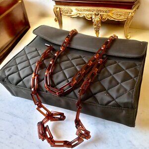 Vintage brown quilted nylon shoulder bag with two plastic chain handles. Top fold-over flap closure with magnet. One back wall interior zipper pocket.