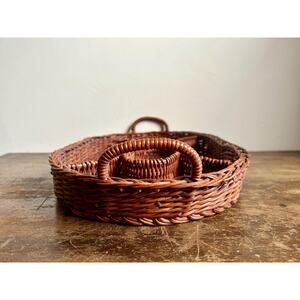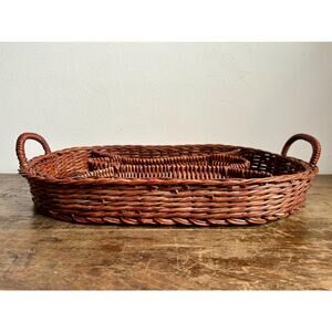 Vintage Brown Rattan Wicker Oval Divided Serving Tray with Handles