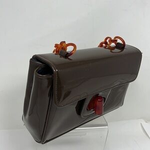 Vintage Brown Structured Patent Bag with Bakelite Chain Strap and Closure