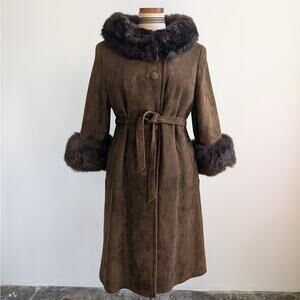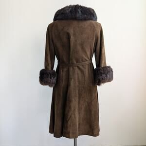 Vintage Brown Suede Penny Lane Jacket Fur Trim Leather Groovy Trench Coat Large