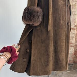 60s Vintage Brown Suede Fur Trim Penny Lane Jacket Furry Leather Groovy Mod Trench Coat