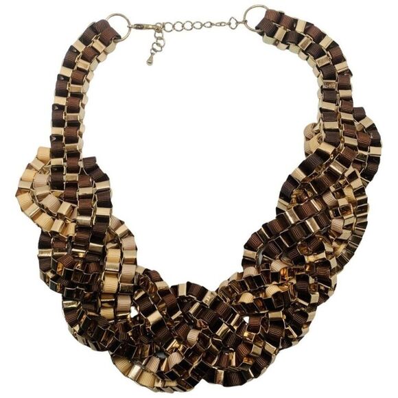 Super Cute oversized chunky braided gold tone box chain with woven dark brown , cinnamon brown, and tan ribbon. Super shiny statement necklace.