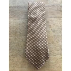 This is a handsome vintage tie in a soft champagnish gold color with white and brown circle like checks in a striped pattern. The tie is polyester and was created for JC Penney's The Men's Shop.