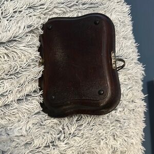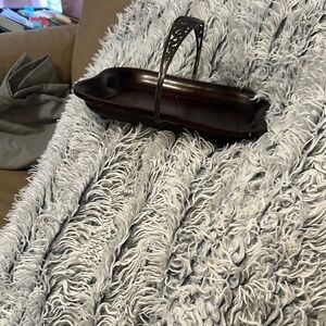 Elegant brown wooden tray with a sturdy scrolled metal handle. Measures 10 inches long by 8 inches wide.