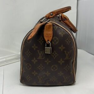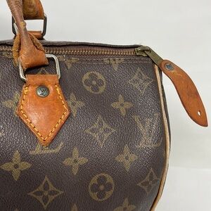 This is a great Vintage Brown Zip Top Satchel 13” x 8” x 7”. As shown. Corner piping shows wear. Handles show wear. Unlined interior. Zipper works. No odors. Can be used for projects.