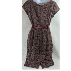 Vintage Brown and Black Floral Eyelet Dress Short Sleeve Lined with Satin Belt