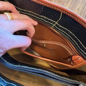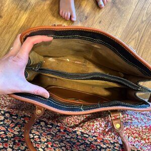 This is a great sized vintage bag, of a leather persuasion (but probably not real leather), with no marked brand anywhere to be found. It's narrow, only 3 inches across at the base, but is 13 inches wide and 11 high, so comfortably fits a notebook or a laptop. 10 inch drop on the handles, which means it's also a comfortable fit over the shoulder. Two sections inside, divided by a zipper pocket the same height and width as the bag, and there is another pocket on the outside of the bag, too. Very cute, and has an excellent vintage vibe.