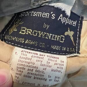 Vintage Browning Arms Co. Sportsman Apparel Insulated Men's Hunting Shooting Coat Jacket. Made USA. Heavy duty covered Talon Zip. Leather trim. Large front pockets have bullet / shell holders. Also has large front side pockets. One large interior pocket. This jacket is sprinkled with light stains throughout, which perfectly gives it that authentic vintage feel without looking dirty or worn out. Otherwise great condition. Own a piece of history!