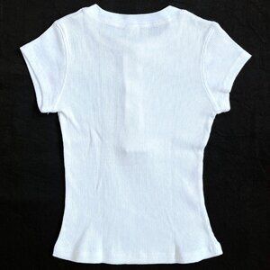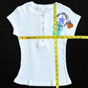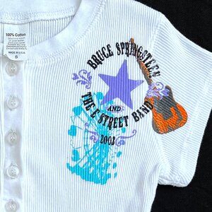 Here is a unique women's tee from Bruce Springsteen & The E Street Band's 2003 Tour. Very rare! Fashion graphic shoulder print on 1/4 button ribbed tee. Size is Small Juniors measuring 11"w x 18.25"h. Gently worn and in excellent condition.