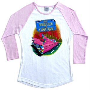 A vintage Bruce Springsteen Women's Baseball Jersey from 1999 that playfully celebrates Springsteen's 1983 Hit "Pink Cadillac. The song was a B-Side release for "Dancing In The Dark. A rare vintage find!