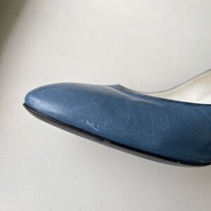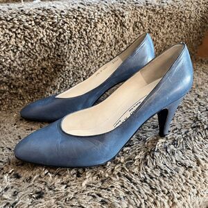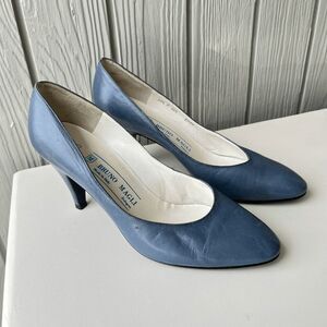 Elegant vintage Bruno Magli pumps, made in Italy from supple slate blue leather with a pointed toe and slender 3" heel. The shade is lighter than navy — a versatile dusty/steel blue that works beautifully with both neutral and pastel wardrobes. Rare in color and design, these are a standout example of Bruno Magli’s heritage craftsmanship.