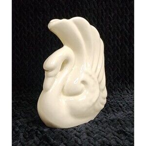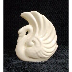Elegant vintage Brush-McCoy small swan planter (#725), made in the United States during the 1950s. Crafted in creamy off-white ceramic with a glossy glaze, this swan features beautiful sculptural details in the wings and body, capturing the graceful curves of mid-century American pottery.