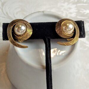Classic vintage gold brushed finish and faux pearl clip-on earrings.