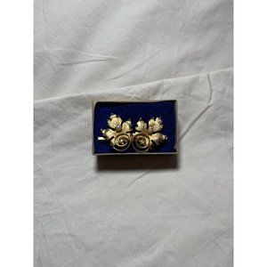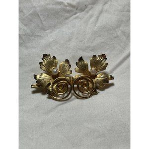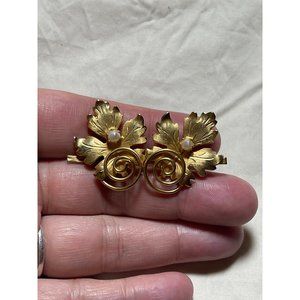 Vintage Brushed Gold Spiral Design Double Leaf Faux Pearl Brooch. Measurements in pics. Very Pretty! No markings/maker's mark I can see, Preowned, better than normal wear. No damage, discoloration or breaks. Clean, smoke-free home. Vintage Fashion Jewelry