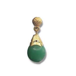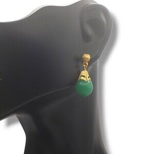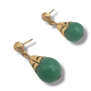 Vintage Brushed Gold Tone Green Stone Bead Dangle Drop Post Pierced Earrings