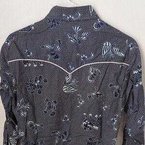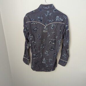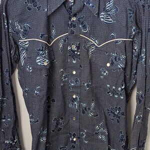 Vintage Brutus Pearl Snap Button Down. Blue and white print. Two pockets with flap and pearl snaps. Pearl snaps at the cuffs. Size medium, neck 15.5, measures 19x27.5. 100% cotton. In excellent condition.