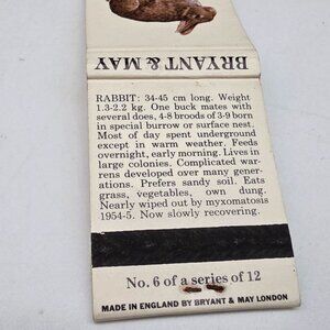 Vintage Bryant & May Wild Animals Of Britain Matchbook Series No. 6 Rabbit
