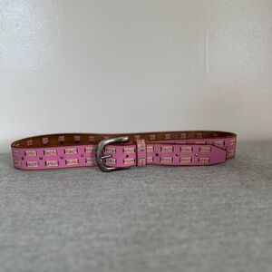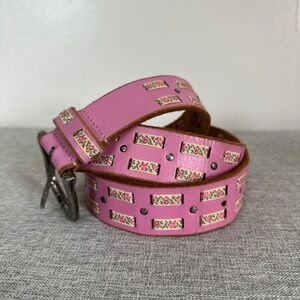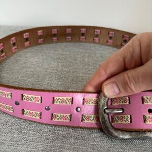 Vintage leather belt in a bubblegum shade of pint featuring a floral ribbon detail woven into the length of the belt. Silver-toned buckle and stud detail. Would be so cute paired with a boho dress or skirt!