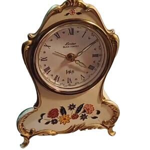 This charming vintage Bucherer wind-up alarm clock, Its cream-colored case features a vibrant floral design and gold trim, while the hands and hour markers glow in the dark. In excellent vintage condition, all functions operate smoothly with minimal wear to the gold trim.