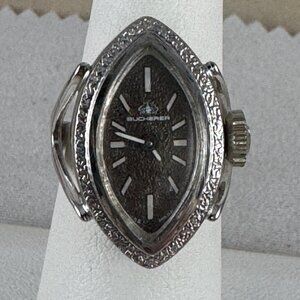 Vintage Bucherer Ring Watch Swiss Made Rhodium Plated is Size 6.5 but can be Adjusted 3-9. Case is 7/8 by 9/16 inch wide Diamond or Marquise Ring Shape, Brownish Dial with White hands and markers. The Acrylic Crystal is almost Perfect. It is a manual wind 17 Jewels Bucherer Movement B on Crown and It works great. It was worn with Love and Care. Has been adjusted to fit a Sized at 6.5. Please see the pictures for details. Back Case Marked 5 2451 working and keeps time. Split Ring Shank may allow up decrease or increase in size
