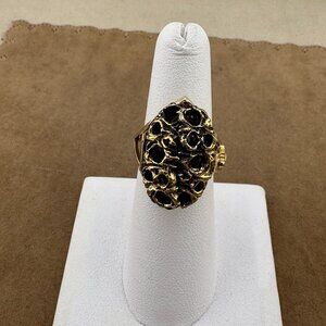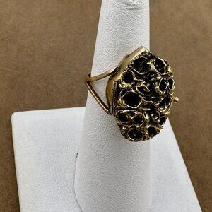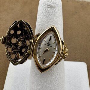Vintage Bucherer Nugget Style Watch Ring Mint Condition 18 Karat Gold 20 Micron Gold Plated Swiss Watch Ring Watch is 7/8 by 5/8 inches with B marked Crown in diameter White Enamel Face gold hands and markers 52189 on reverse It is a manual wind 17 Jewels Bucherer Movement B on Crown and It works great. It was bought in Switzerland and worn with Love and Care. Fixed at size at 6 . Please see the pictures for details BTW this can be re sized