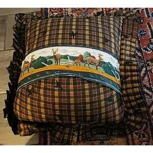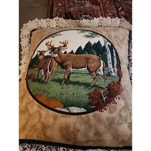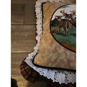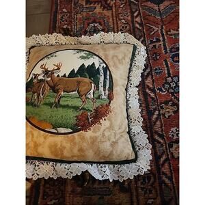 Vintage Buck Doe Deer 18" Throw Pillow Cover Lace Trim Cabin Hunt Cottagecore