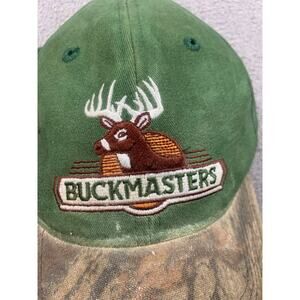 Vintage Buckmasters hunting cap featuring embroidered buck logo on the front. Classic green crown with camouflage print bill. Adjustable back closure.