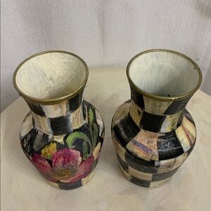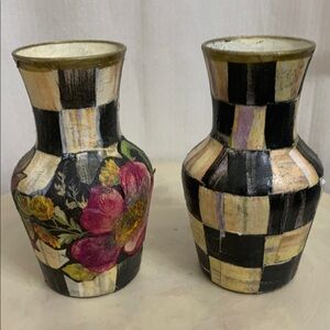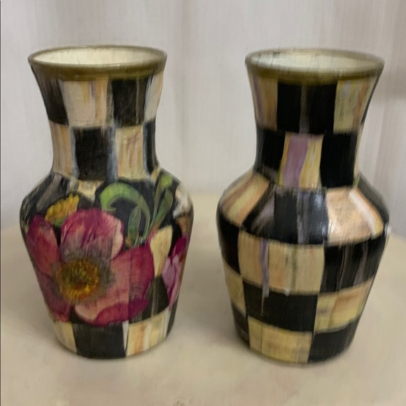 Enhance your home decor with these stylish checkered vases featuring a vibrant floral design. The black and pink colors add a touch of elegance to any room. Hand painted and decoupaged with authentic Mackenzie Childs Vintage design Courtly Check and Flower Market paper napkins, acrylic paint and glossy sealant. Please see photos for complete description including measurements. Price is firm due to artist talent, skill and time. These items are one of a kind unique works of art. Price is $100 for the set of two.