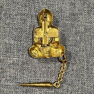 This is a vintage gold-tone tie clip / tie tack featuring a detailed seated Buddha design. The piece includes its original chain and pointed drop bar for securing to a shirt. A unique and spiritual-themed men’s accessory, perfect for collectors or anyone looking to add a touch of vintage style.