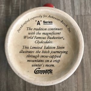 On bottom: "Handcrafted expressly for Anheuser-Busch, Inc. “A” Series The tradition continues with the magnificent World Famous Budweiser Clydesdales. This limited Edition Stein illustrates the hitch journeying through snow-capped mountains on a crisp winter's morn. Ceramarte Brazil”