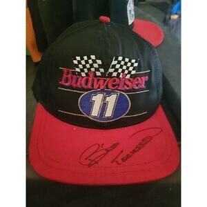 This limited edition Budweiser Bill Elliott #11 cap hat is a must-have for any NASCAR fan. Show your love for the sport and the iconic Budweiser brand with this vintage, adjustable trucker hat in classic black. The hat is signed by Bill Elliott himself, adding a personal touch to your collection.