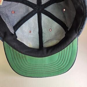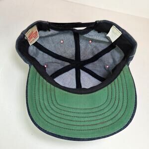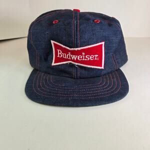 Classic vintage Budweiser snapback hat from the 1980s, made by West-Chester Hat in St. Louis, Missouri. Features dark denim fabric with red contrast stitching, embroidered Budweiser bowtie logo patch, and an adjustable snapback closure. True vintage USA-made beer advertising collectible in solid wearable condition. Perfect for beer memorabilia collectors, vintage hat enthusiasts, or fans of retro Budweiser merch.