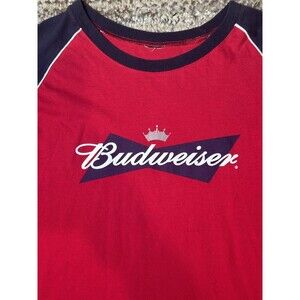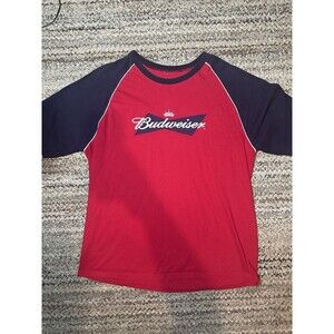 This vintage Budweiser racing top t-shirt is a must-have for any hipster or designer who loves cars, beer, and the USA. The red and blue graphic print features the iconic Budweiser logo and is made of comfortable, machine-washable cotton knit fabric. The short-sleeved crew neck shirt is perfect for all seasons and fits true to size.