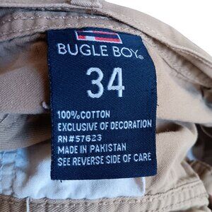 Relive the rugged charm of days gone by with these vintage Bugle Boy cargo shorts. Made in Pakistan, these shorts feature ample storage, perfect for anyone seeking practicality intertwined with classic style. The luxurious beige cotton ensures comfort, making these shorts a nostalgic addition to any wardrobe.