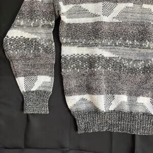 Authentic vintage Bugle Boy Co. men’s sweater, made in Korea, featuring a bold 90s textured knit pattern in shades of gray, white, and black. This mid-weight crewneck pullover blends cozy comfort with a distinct retro aesthetic — perfect for layering or vintage streetwear outfits.