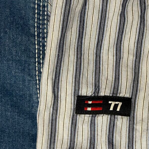 The Vintage Bugle Boy Denim Striped Shirt is a stylish and classic piece from the 1980s, featuring a button-front design with long sleeves and made from 100% cotton. This men's shirt is perfect for casual occasions, with a chest size of 48 inches and a regular fit. The blue color and denim material give it a timeless and rugged look that is ideal for those who appreciate vintage fashion with a hint of rockabilly style. Made in El Salvador, this original piece is a must-have addition to any wardrobe looking for a touch of retro charm.