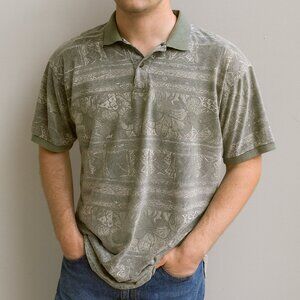 Bring on the retro island vibes with this bold 90s Bugle Boy Hawaiian polo. Lightweight and playful with a light green base accented by tan and subtle floral print, this is perfect for summer weekends, backyard BBQs, or layering under an open shirt.