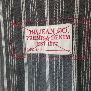 Gray short sleeve denim button front shirt with vertical stripes and a few Bugle Boy patches. Metal rivet buttons. 100% cotton. One chest pocket on the left side.