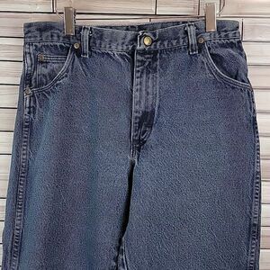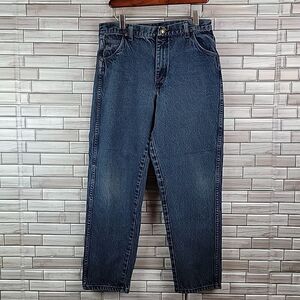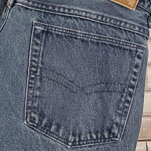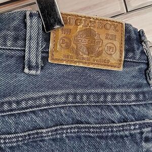 100%cotton tough and durable blue denim jeans in classic 80s style by Bugle Boy with a high waist, straight leg, and leather patch logo tag. Good pre-owned condition with normal wash and wear, including some great natural fading.